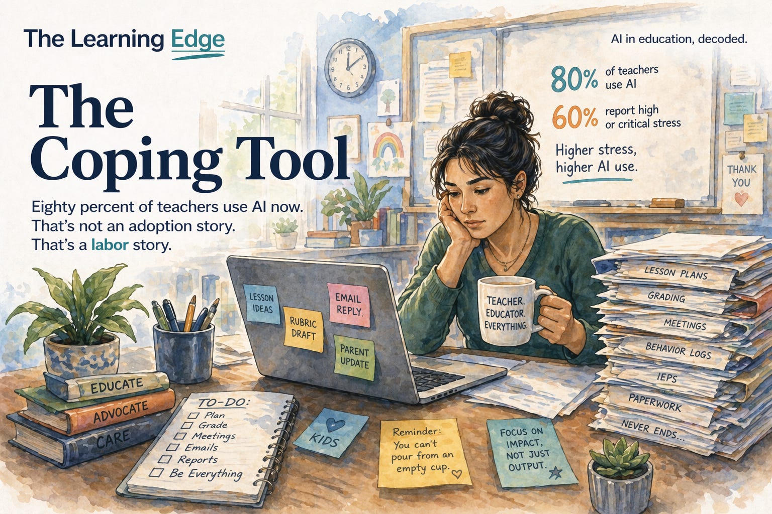 Eighty percent of teachers now use generative AI in their classrooms. Sixty percent of those same teachers describe their workload as “high” or “critical.” And the higher the stress, the higher the AI use.
